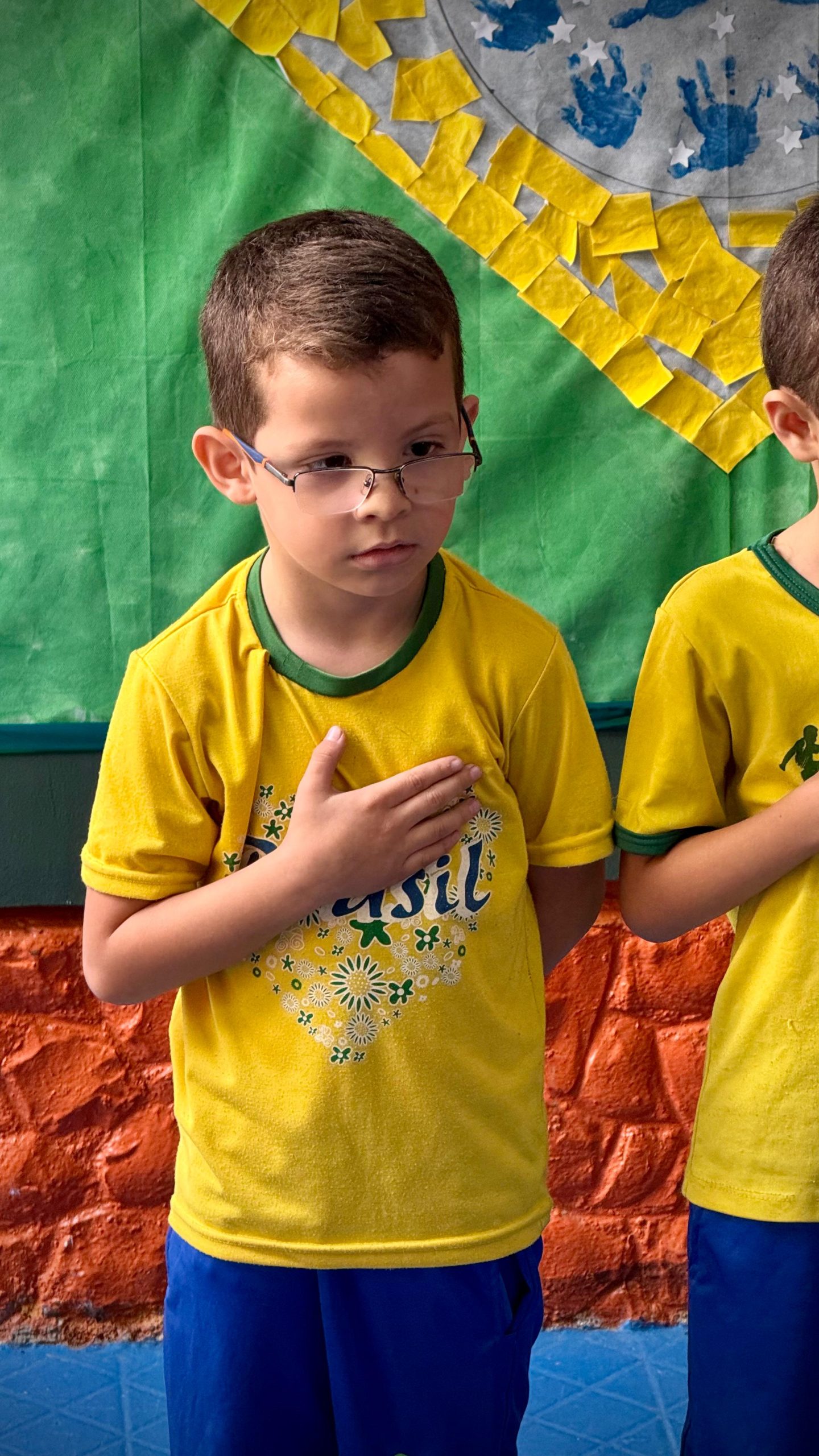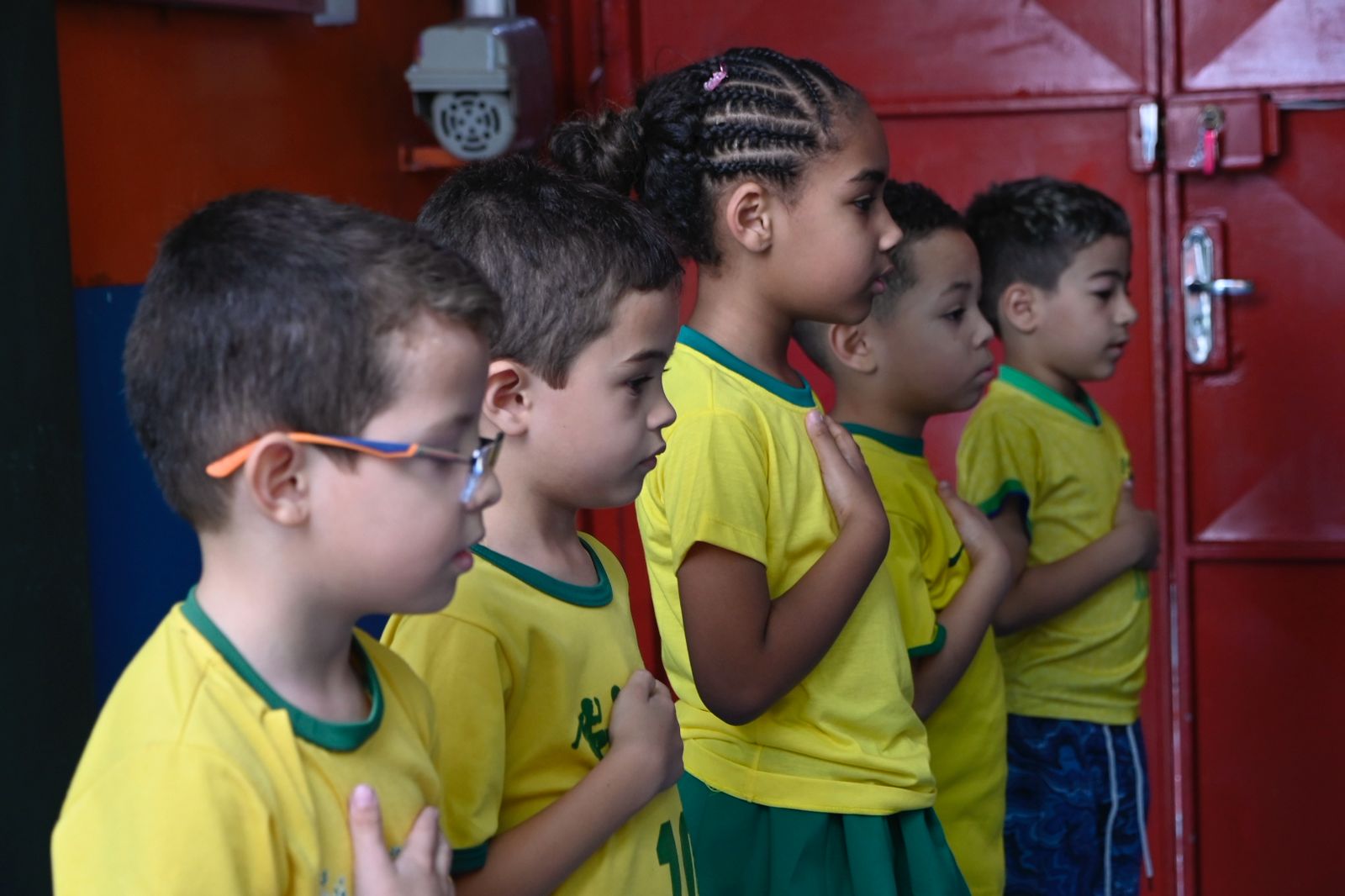 Além do teatro, os alunos também cantaram o Hino Nacional. Reunidos no pátio, com atenção e respeito, as crianças entoaram os versos do hino, vivenciando um dos principais rituais de cidadania.
